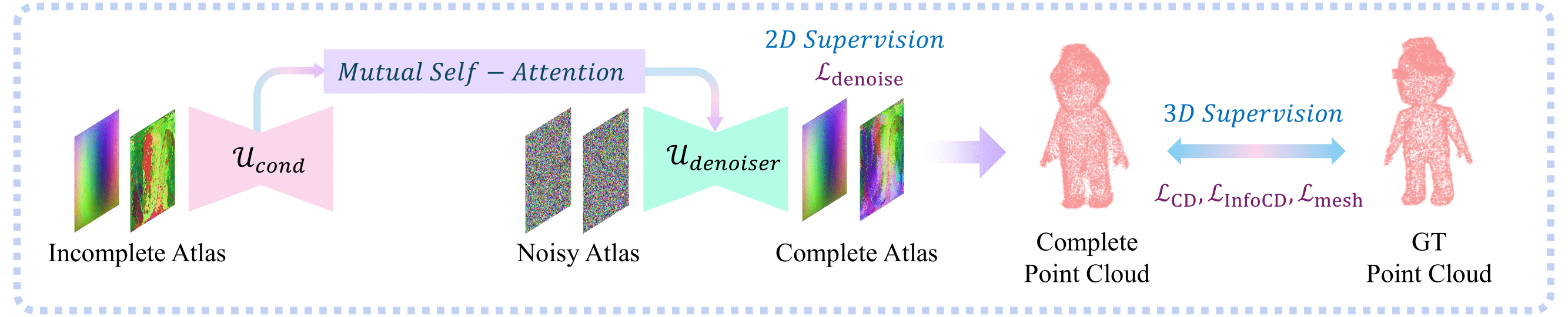3D reconstruction losses (i.e., L_CD, L_InfoCD, L_mesh) complement the standard 2D diffusion objective (i.e., L_denoise). The incomplete atlas is
